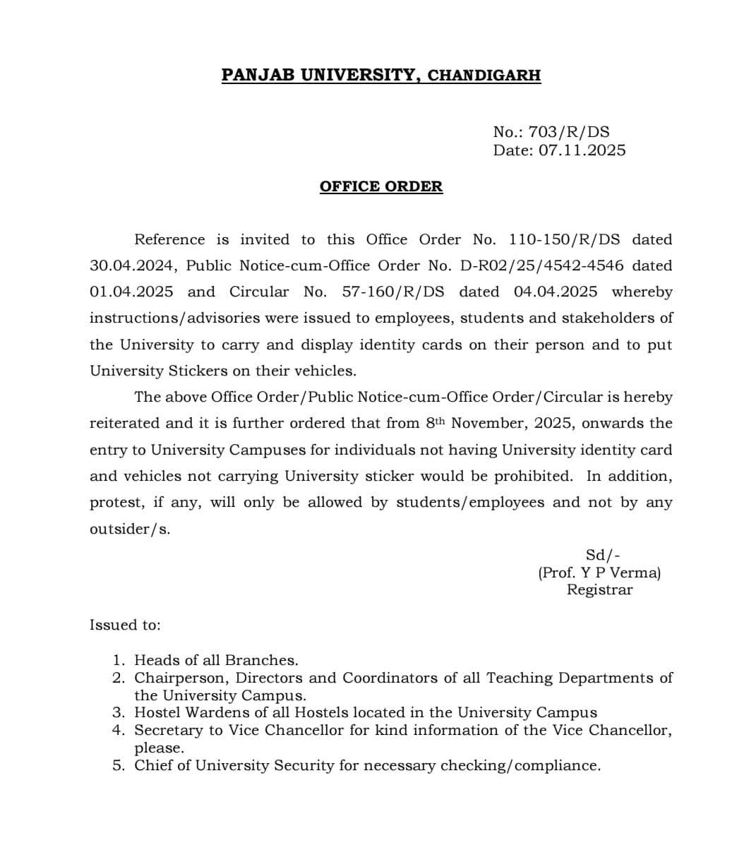 ਚੰਡੀਗੜ੍ਹ, 8 ਨਵੰਬਰ 2025 : ਪੰਜਾਬ ਯੂਨੀਵਰਸਿਟੀ 'ਚ ਵਿਦਿਆਰਥੀਆਂ ਵੱਲੋਂ 10 ਨਵੰਬਰ ਨੂੰ ਸੱਦੇ ਗਏ "ਬੰਦ" ਤੋਂ ਪਹਿਲਾਂ, ਯੂਨੀਵਰਸਿਟੀ ਪ੍ਰਸ਼ਾਸਨ ਨੇ ਅੱਜ (ਸ਼ਨੀਵਾਰ) ਨੂੰ ਕੈਂਪਸ 'ਚ ਸਖ਼ਤ ਪਾਬੰਦੀਆਂ ਲਾਗੂ ਕਰ ਦਿੱਤੀਆਂ ਹਨ। ਇਨ੍ਹਾਂ ਨਵੇਂ ਨਿਰਦੇਸ਼ਾਂ ਤਹਿਤ, ਬਾਹਰੀ ਲੋਕਾਂ ਅਤੇ ਵਾਹਨਾਂ ਦੀ ਐਂਟਰੀ 'ਤੇ ਪੂਰੀ ਤਰ੍ਹਾਂ ਰੋਕ ਲਗਾ ਦਿੱਤੀ ਗਈ ਹੈ ਅਤੇ ਵਿਦਿਆਰਥੀਆਂ ਲਈ ਵੀ ID ਕਾਰਡ ਪਹਿਨਣਾ ਲਾਜ਼ਮੀ ਕਰ ਦਿੱਤਾ ਗਿਆ ਹੈ।
