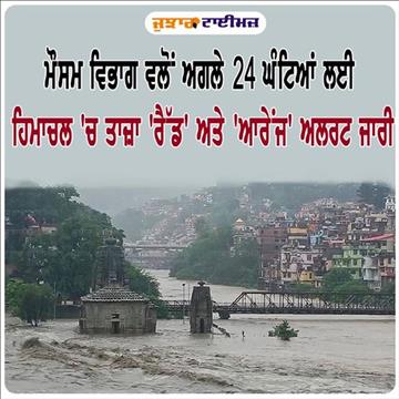 ਮੌਸਮ ਵਿਭਾਗ ਵਲੋਂ ਅਗਲੇ 24 ਘੰਟਿਆਂ ਲਈ ਹਿਮਾਚਲ 'ਚ ਤਾਜ਼ਾ 'ਰੈੱਡ' ਅਤੇ 'ਆਰੇਂਜ' ਅਲਰਟ ਜਾਰੀ